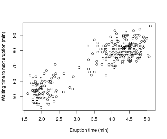 The value of the variable faithful is a data frame with two variables recorded for eruptions of the Old Faithful geyser in Yellowstone National Park: