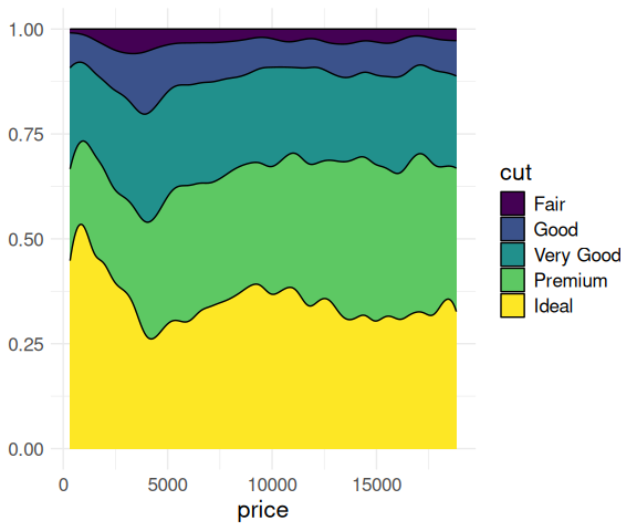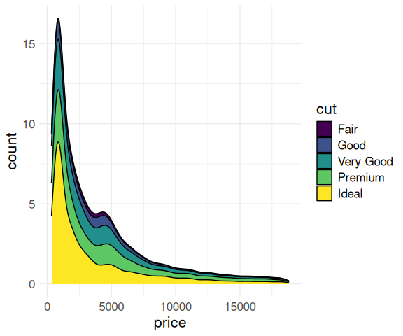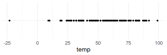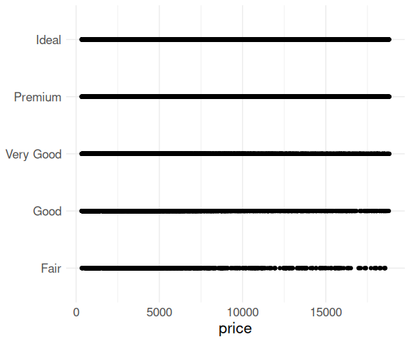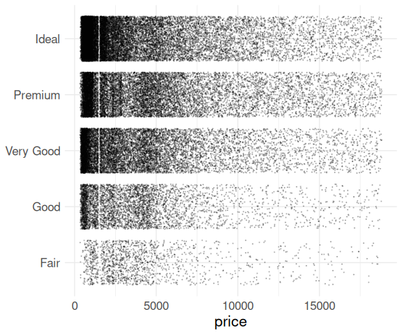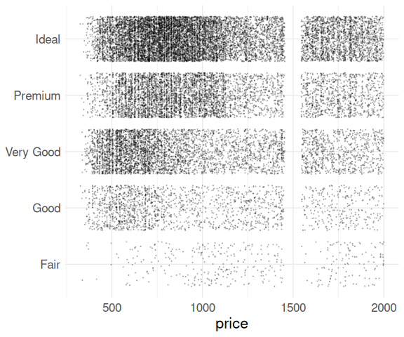 LS0tCnRpdGxlOiAiVmlzdWFsaXppbmcgRGlzdHJpYnV0aW9ucyIKb3V0cHV0OgogIGh0bWxfZG9jdW1lbnQ6CiAgICB0b2M6IHllcwogICAgY29kZV9mb2xkaW5nOiBzaG93CiAgICBjb2RlX2Rvd25sb2FkOiB0cnVlCi0tLQoKPGxpbmsgcmVsPSJzdHlsZXNoZWV0IiBocmVmPSJzdGF0NDU4MC5jc3MiIHR5cGU9InRleHQvY3NzIiAvPgo8IS0tIHRpdGxlIGJhc2VkIG9uIFdpbGtlJ3MgY2hhcHRlciAtLT4KCmBgYHtyIHNldHVwLCBpbmNsdWRlID0gRkFMU0UsIG1lc3NhZ2UgPSBGQUxTRX0Kc291cmNlKGhlcmU6OmhlcmUoInNldHVwLlIiKSkKa25pdHI6Om9wdHNfY2h1bmskc2V0KGNvbGxhcHNlID0gVFJVRSwgbWVzc2FnZSA9IEZBTFNFLAogICAgICAgICAgICAgICAgICAgICAgZmlnLmhlaWdodCA9IDUsIGZpZy53aWR0aCA9IDYsIGZpZy5hbGlnbiA9ICJjZW50ZXIiKQoKc2V0LnNlZWQoMTIzNDUpCmxpYnJhcnkoZHBseXIpCmxpYnJhcnkoZ2dwbG90MikKbGlicmFyeShsYXR0aWNlKQpsaWJyYXJ5KGdyaWRFeHRyYSkKc291cmNlKGhlcmU6OmhlcmUoImRhdGFzZXRzLlIiKSkKYGBgCgoKIyMgSW50cm9kdWN0aW9uCgpPbmNlIHRoZXJlIGFyZSBtb3JlIHRoYW4gYSBoYW5kZnVsIG9mIG51bWVyaWMgZGF0YSB2YWx1ZXMgaXQgaXMgb2Z0ZW4KdXNlZnVsIHRvIHN0ZXAgYmFjayBhbmQgbG9vayBhdCB0aGUgX2Rpc3RyaWJ1dGlvbl8gb2YgdGhlIGRhdGEgdmFsdWVzOgoKKiBXaGVyZSBpcyB0aGUgYnVsayBvZiB0aGUgZGF0YSBsb2NhdGVkPwoKKiBJcyB0aGVyZSBhIHNpbmdsZSBhcmVhIG9mIGNvbmNlbnRyYXRpb24gb3IgYXJlIHRoZXJlIHNldmVyYWw/CgoqIElzIHRoZSBkYXRhIGRpc3RyaWJ1dGlvbiBzeW1tZXRyaWMgb3IgaXMgaXQgc2tld2VkLCBpLmUuIHRyYWlscyBvZmYKICBtb3JlIHNsb3dseSBpbiBvbmUgZGlyZWN0aW9uIG9yIGFub3RoZXI/CgoqIEFyZSB0aGVyZSBleHRyZW1lLCBvciBvdXRseWluZywgdmFsdWVzPwoKKiBBcmUgdGhlcmUgYW55IHN1c3BpY2lvdXMgb3IgaW1wb3NzaWJsZSB2YWx1ZXM/CgoqIEFyZSB0aGVyZSBnYXBzIGluIHRoZSBkYXRhPwoKKiBJcyB0aGVyZSByb3VuZGluZywgZS5nLiB0byBpbnRlZ2VyIHZhbHVlcywgb3IgX2hlYXBpbmdfLCBpLmUuIGEKICBmZXcgcGFydGljdWxhciB2YWx1ZXMgb2NjdXIgdmVyeSBmcmVxdWVudGx5PwoKUGxvdHMgZm9yIHZpc3VhbGl6aW5nIGRpc3RyaWJ1dGlvbnMgaW5jbHVkZQoKKiBTdHJpcCBwbG90cy4KCiogSGlzdG9ncmFtcy4KCiogRGVuc2l0eSBwbG90cy4KCiogQm94IHBsb3RzLgoKKiBWaW9saW4gcGxvdHMuCgoqIFN3YXJtIHBsb3RzLgoKKiBEZW5zaXR5IHJpZGdlcwoKCiMjIFN0cmlwIFBsb3RzCgoKIyMjIFN0cmlwIFBsb3QgQmFzaWNzCgpBIHZhcmlhbnQgb2YgdGhlIGRvdCBwbG90IGlzIGtub3duIGFzIGEgX3N0cmlwIHBsb3RfLgoKQSBzdHJpcCBwbG90IGZvciB0aGUgY2l0eSB0ZW1wZXJhdHVyZSBkYXRhIGlzCgpgYGB7ciwgZmlnLmhlaWdodCA9IDIsIHdhcm5pbmcgPSBGQUxTRSwgY2xhc3Muc291cmNlID0gImZvbGQtaGlkZSJ9CnRobSA8LSB0aGVtZV9taW5pbWFsKCkgKwogICAgdGhlbWUodGV4dCA9IGVsZW1lbnRfdGV4dChzaXplID0gMTYpKQpnZ3Bsb3QoY2l0eXRlbXBzKSArCiAgICBnZW9tX3BvaW50KGFlcyh4ID0gdGVtcCwgeSA9ICJBbGwiKSkgKwogICAgdGhtICsKICAgIHRoZW1lKGF4aXMudGl0bGUueSA9IGVsZW1lbnRfYmxhbmsoKSwKICAgICAgICAgIGF4aXMudGV4dC55ID0gZWxlbWVudF9ibGFuaygpKQpgYGAKClRoZSBzdHJpcCBwbG90IGNhbiByZXZlYWwgZ2FwcyBhbmQgb3V0bGllcnMuCgpBZnRlciBsb29raW5nIGF0IHRoZSBwbG90IHdlIG1pZ2h0IHdhbnQgdG8gZXhhbWluZSB0aGUgaGlnaCBhbmQKbG93IHZhbHVlczoKCmBgYHtyfQpmaWx0ZXIoY2l0eXRlbXBzLCB0ZW1wID4gODUpCmZpbHRlcihjaXR5dGVtcHMsIHRlbXAgPCAxMCkKYGBgCgpGb3IgdGhlIGVydXB0aW9uIGR1cmF0aW9ucyBpbiB0aGUgYGZhaXRoZnVsYCBkYXRhIGEgc3RyaXAgcGxvdCBzaG93cwp0aGUgdHdvIG1vZGVzIGFyb3VuZCAyIGFuZCA0IG1pbnV0ZXM6CgpgYGB7ciwgZmlnLmhlaWdodCA9IDIsIHdhcm5pbmcgPSBGQUxTRSwgY2xhc3Muc291cmNlID0gImZvbGQtaGlkZSJ9CmdncGxvdChmYWl0aGZ1bCkgKwogICAgZ2VvbV9wb2ludChhZXMoeCA9IGVydXB0aW9ucywgeSA9ICJBbGwiKSkgKwogICAgdGhtICsKICAgIHRoZW1lKGF4aXMudGl0bGUueSA9IGVsZW1lbnRfYmxhbmsoKSwKICAgICAgICAgIGF4aXMudGV4dC55ID0gZWxlbWVudF9ibGFuaygpKQpgYGAKCgojIyMgTXVsdGlwbGUgR3JvdXBzCgpTdHJpcCAgcGxvdHMgYXJlIG1vc3QgdXNlZnVsIGZvciBzaG93aW5nIHN1YnNldHMgY29ycmVzcG9uZGluZyB0byBhCmNhdGVnb3JpY2FsIHZhcmlhYmxlLgoKQSBzdHJpcCBwbG90IGZvciB0aGUgeWllbGRzIGZvciBkaWZmZXJlbnQgdmFyaWV0aWVzIGluIHRoZSBiYXJsZXkgZGF0YQppcwoKYGBge3IsIGNsYXNzLnNvdXJjZSA9ICJmb2xkLWhpZGUifQpnZ3Bsb3QoYmFybGV5KSArCiAgICBnZW9tX3BvaW50KGFlcyh4ID0geWllbGQsIHkgPSB2YXJpZXR5KSkgKwogICAgdGhlbWVfbWluaW1hbCgpICsKICAgIHRobQpgYGAKCgojIyMgU2NhbGFiaWxpdHkKClNjYWxhYmlsaXR5IGluIHRoaXMgZm9ybSBpcyBsaW1pdGVkIGR1ZSB0byBvdmVyLXBsb3R0aW5nLgoKQSBzaW1wbGUgc3RyaXAgcGxvdCBvZiBgcHJpY2VgIHdpdGhpbiB0aGUgZGlmZmVyZW50IGBjdXRgIGxldmVscyBpbgp0aGUgYGRpYW1vbmRzYCBkYXRhIGlzIG5vdCB2ZXJ5IGhlbHBmdWw6CgpgYGB7ciwgY2xhc3Muc291cmNlID0gImZvbGQtaGlkZSJ9CmdncGxvdChkaWFtb25kcykgKwogICAgZ2VvbV9wb2ludChhZXMoeCA9IHByaWNlLCB5ID0gY3V0KSkgKwogICAgdGhtICsKICAgIHRoZW1lKGF4aXMudGl0bGUueSA9IGVsZW1lbnRfYmxhbmsoKSkKYGBgCgpTZXZlcmFsIGFwcHJvYWNoZXMgYXJlIGF2YWlsYWJsZSB0byByZWR1Y2UgdGhlIGltcGFjdCBvZiBvdmVyLXBsb3R0aW5nOgoKKiByZWR1Y2UgdGhlIHBvaW50IHNpemU7CgoqIHJhbmRvbSBkaXNwbGFjZW1lbnQgb2YgcG9pbnRzLCBjYWxsZWQgX2ppdHRlcmluZ187CgoqIG1ha2luZyB0aGUgcG9pbnRzIHRyYW5zbHVjZW50LCBvciBfYWxwaGEgYmxlbmRpbmdfLgoKQ29tYmluaW5nIGFsbCB0aHJlZSBmb3IgZXhhbWluaW5nIGBwcmljZWAgd2l0aGluIGBjdXRgIGZvciB0aGUKYGRpYW1vbmRzYCBkYXRhIHByb2R1Y2VzCgpgYGB7ciwgY2xhc3Muc291cmNlID0gImZvbGQtaGlkZSJ9CmdncGxvdChkaWFtb25kcykgKwogICAgZ2VvbV9wb2ludChhZXMoeCA9IHByaWNlLCB5ID0gY3V0KSwKICAgICAgICAgICAgICAgc2l6ZSA9IDAuMiwKICAgICAgICAgICAgICAgcG9zaXRpb24gPSBwb3NpdGlvbl9qaXR0ZXIod2lkdGggPSAwKSwKICAgICAgICAgICAgICAgYWxwaGEgPSAwLjIpICsKICAgIHRobSArIHRoZW1lKGF4aXMudGl0bGUueSA9IGVsZW1lbnRfYmxhbmsoKSkKYGBgCgpTa2V3bmVzcyBvZiB0aGUgcHJpY2UgZGlzdHJpYnV0aW9ucyBjYW4gYmUgc2VlbiBpbiB0aGlzIHBsb3QsIHRob3VnaApvdGhlciBhcHByb2FjaGVzIHdpbGwgc2hvdyB0aGlzIG1vcmUgY2xlYXJseS4KCkEgcGVjdWxpYXIgZmVhdHVyZSByZXZlbGVkIGJ5IHRoaXMgcGxvdCBpcyB0aGUgZ2FwIGJlbG93CjIwMDAuCgpFeGFtaW5pbmcgdGhlIHN1YnNldCB3aXRoIGBwcmljZSA8IDIwMDBgIHNob3dzIHRoZSBnYXAgaXMKcm91Z2hseSBzeW1tZXRyaWMgYXJvdW5kIDE1MDA6CgpgYGB7ciwgY2xhc3Muc291cmNlID0gImZvbGQtaGlkZSJ9CmdncGxvdChmaWx0ZXIoZGlhbW9uZHMsIHByaWNlIDwgMjAwMCkpICsKICAgIGdlb21fcG9pbnQoYWVzKHggPSBwcmljZSwgeSA9IGN1dCksCiAgICAgICAgICAgICAgIHNpemUgPSAwLjIsCiAgICAgICAgICAgICAgIHBvc2l0aW9uID0gcG9zaXRpb25faml0dGVyKHdpZHRoID0gMCksCiAgICAgICAgICAgICAgIGFscGhhID0gMC4yKSArCiAgICB0aG0gKwogICAgdGhlbWUoYXhpcy50aXRsZS55ID0gZWxlbWVudF9ibGFuaygpKQpgYGAKCkEgcGxvdCBhbG9uZyB0aGVzZSBsaW5lcyB3YXMgdXNlZCBvbiB0aGUgTmV3IFlvcmsgVGltZXMgW2Zyb250IHBhZ2UgZm9yCkZlYnJ1YXJ5IDIxLCAyMDIxXShgciBJTUcoIk5ZVC0yMDIxLTAyLTIxLmpwZWciKWApLgoKYGBge3IsIGVjaG8gPSBGQUxTRSwgb3V0LndpZHRoID0gIjU1JSJ9CmtuaXRyOjppbmNsdWRlX2dyYXBoaWNzKElNRygiTllULTIwMjEtMDItMjEuanBlZyIpKQpgYGAKCgojIyMgU29tZSBOb3RlcwoKKiBXaXRoIGEgZ29vZCBjb21iaW5hdGlvbiBvZiBwb2ludCBzaXplIGNob2ljZSwgaml0dGVyaW5nLCBhbmQgYWxwaGEKICBibGVuZGluZyB0aGUgc3RyaXAgcGxvdCBmb3IgZ3JvdXBzIG9mIGRhdGEgY2FuIHNjYWxlIHRvIHNldmVyYWwKICBodW5kcmVkIHRob3VzYW5kIG9ic2VydmF0aW9ucyBhbmQgdGVuIHRv