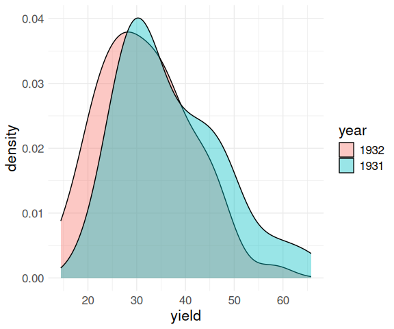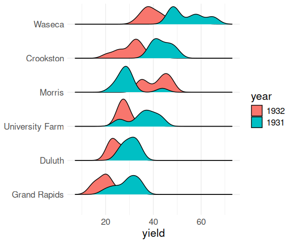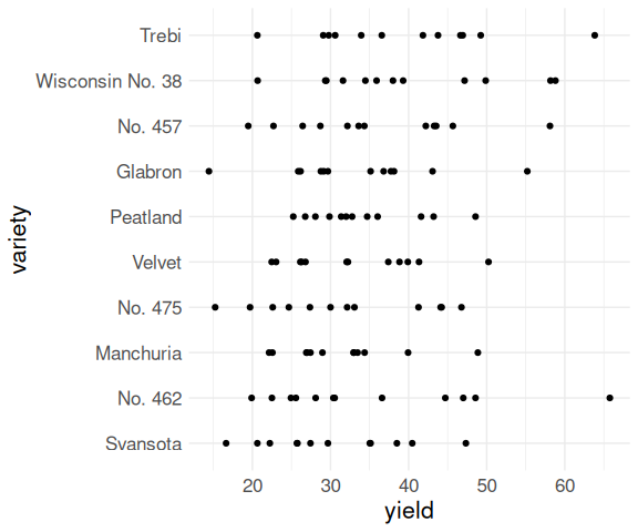 ggplot(mutate(barley, year = reorder(year, -yield))) +
