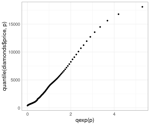 geom_point(aes(x = log10(qweibull(p, 1, 1)), y = log10(sort(price)))) +