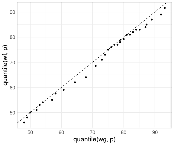 geom_point(aes(x = quantile(wg, p), y = quantile(wf, p))) +
