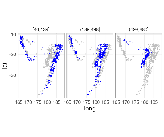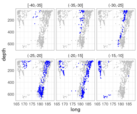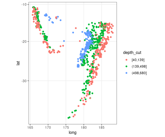 For the quakes data, breaking the depth values into thirds gives some insights: