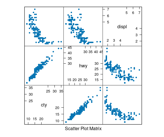 splom(select(mpg, cty, hwy, displ),