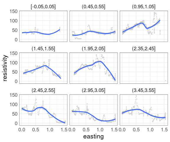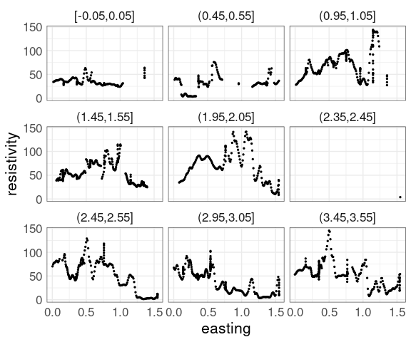 Data from Cleveland’s Visualizing Data book contains measurements of soil resistivity of an agricultural field along a roughly rectangular grid.