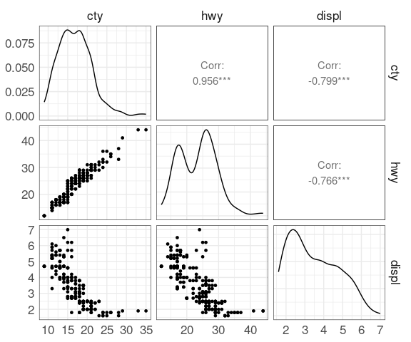 ggpairs(select(mpg, cty, hwy, displ),