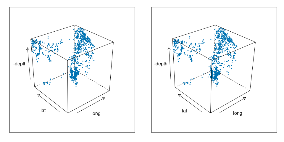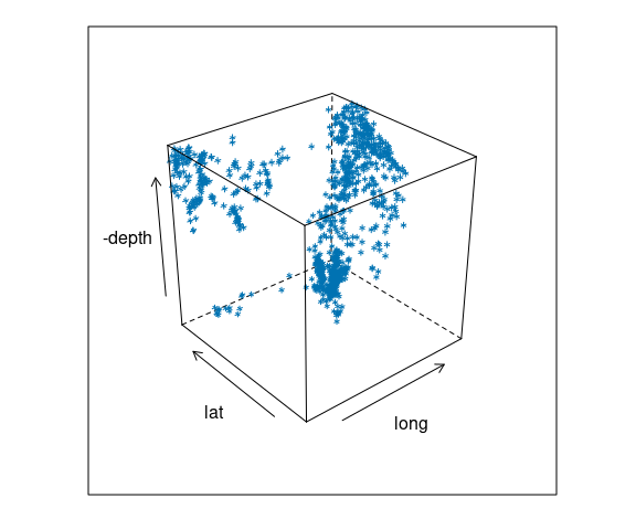 The quakes data frame contains data on locations of seismic events of magnitude 4.0 or larger in a region near Fiji.