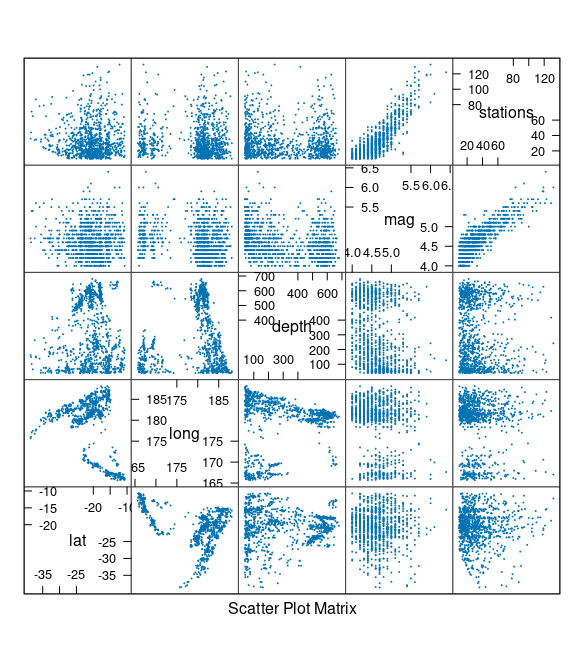 splom(quakes, cex = 0.1, pch = 19)