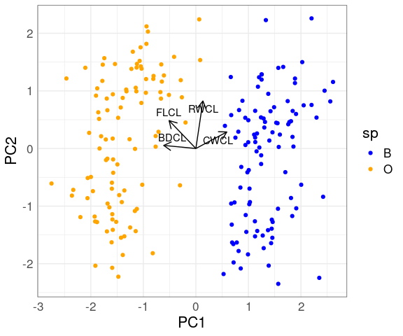 The two species are separated quite well by the first principal component alone.