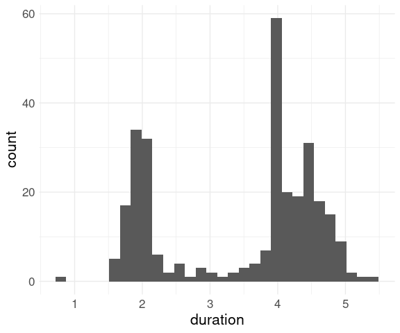 A histogram of eruption durations for another data set on Old Faithful eruptions, this one from package MASS: